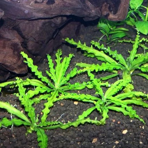 Roślina niska, liście wydłużone, ostro zakończone i zebrane w rozetę, zielone, na pierwszy plan.