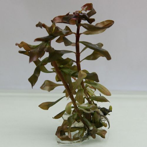 Roślina łodygowa, liściasta, wysoka, liście od spodu wybarwiają się na kolor czerwony, Roślina łodygowa, drobne liście, wysoka, barwa od zielonego przez bordo po brąz (zależy od nawożenia i oświetlenia), tylny plan akwarium.